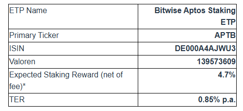 Bitwise Asset Management staat op het punt om het Aptos staking ETP (APTB) te lanceren op de Zwitserse beurs SIX op 19 november, wat een belangrijke stap markeert in het landschap van crypto-activa investeringen. Als eerste Aptos staking ETP toont het de toewijding van Bitwise om investeringsmogelijkheden uit te breiden. APTB richt zich op zowel institutionele als particuliere investeerders, en biedt dagelijkse liquiditeit op de beurs met potentiële rendementen van ongeveer 4,7% na kosten door staking.
