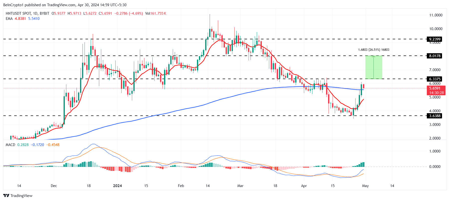 Het recente herstel sluit echter niet alleen de death cross uit, maar vormt ook een golden cross. Dit zou de HNT koers voorbij het $6,33-weerstandniveau kunnen brengen. De opleving zou Helium in staat kunnen stellen een rally van 26% in te zetten om $7 en $8 als steun op te eisen.