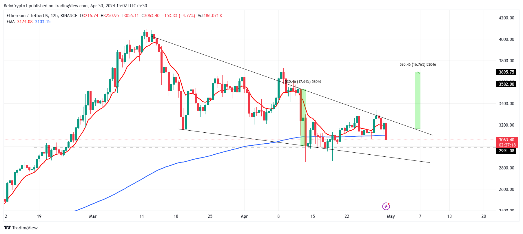 De Ethereum koers die wordt verhandeld op $3.063 slaagde er niet in om voorbij de bovenste trendlijn te breken. Deze trendlijn is onderdeel van een dalende wig waar ETH sinds maart in vastzit. Na mislukte pogingen in het verleden zou de op één na grootste crypto asset ter wereld kunnen uitbreken na een boune vanaf $2.991.