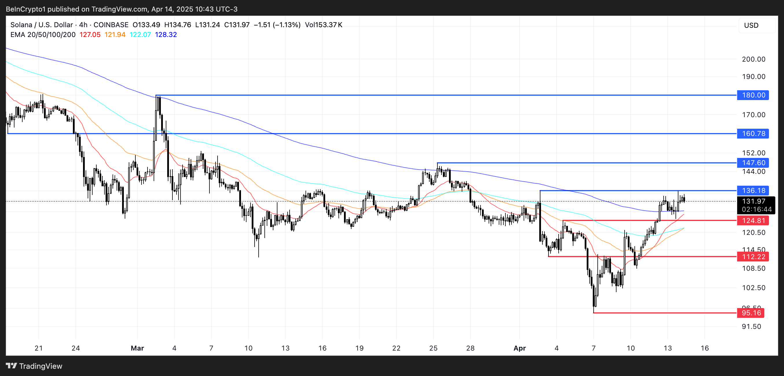 Als het huidige momentum aanhoudt, zou SOL binnenkort de weerstand kunnen doorbreken op $136 en mikken op $147 en $160. Een sterkere rally zou het potentieel naar $180 kunnen duwen—niveaus die voor het laatst begin maart werden gezien.