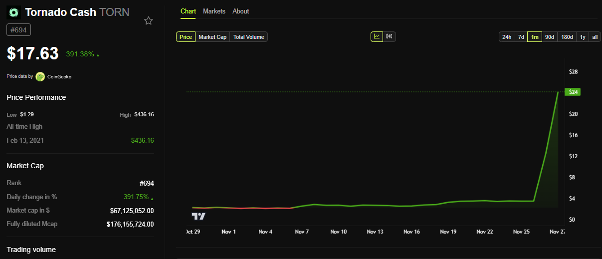SponsoredNa de uitspraak is de native token van Tornado Cash, TORN, echter met bijna 400% gestegen en wordt verhandeld voor $17,63 op het moment van schrijven.