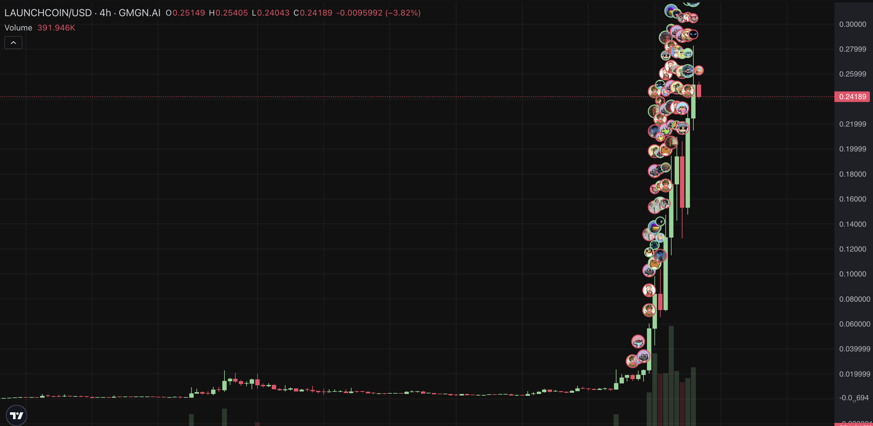LAUNCHCOIN is het middelpunt van de aandacht geworden doordat de waarde in slechts 24 uur met meer dan 348% is gestegen. Met een marktkapitalisatie van meer dan $230 miljoen en een 24-uurs handelsvolume van $126 miljoen, toont LAUNCHCOIN sterk momentum in de markt.