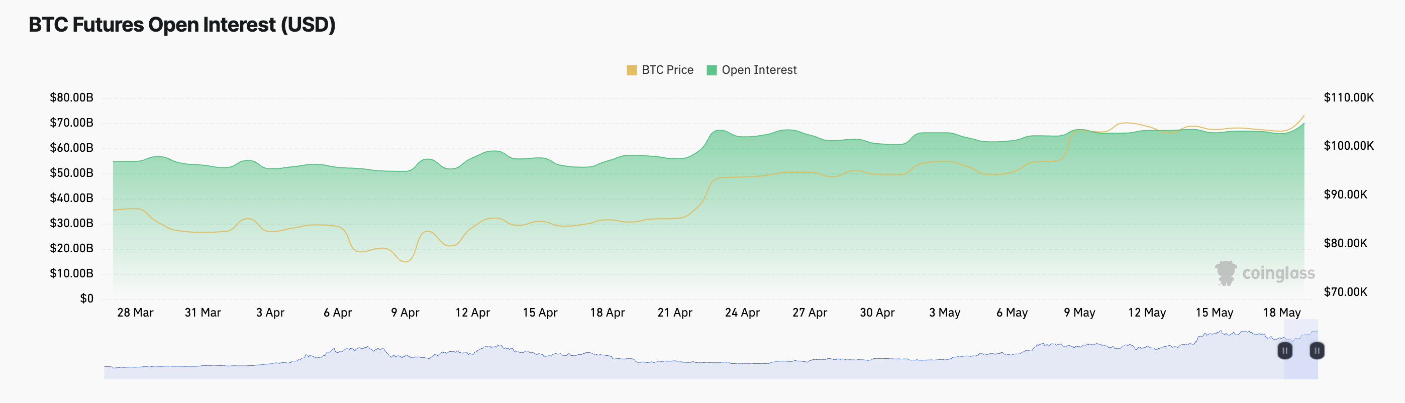 De koersstijging van BTC gaat gepaard met een stijging in de futures open interest. Deze staat op $70,03 miljard op het moment van schrijven, een stijging van 7% in de afgelopen dag.