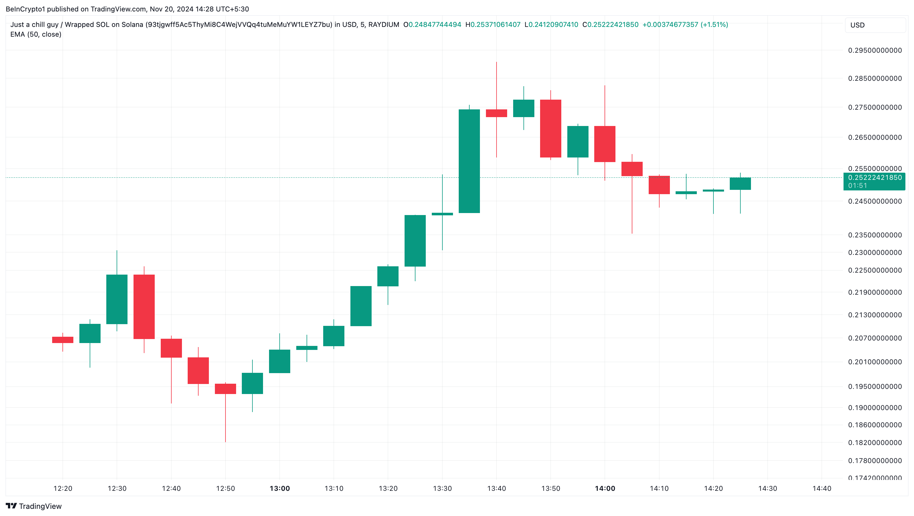 Hoewel de token aanvankelijk steeg naar $0,28, heeft winstneming de koers teruggedrongen naar $0,24. Als dit doorgaat, zou de koers van CHILLGUY verder kunnen dalen.
