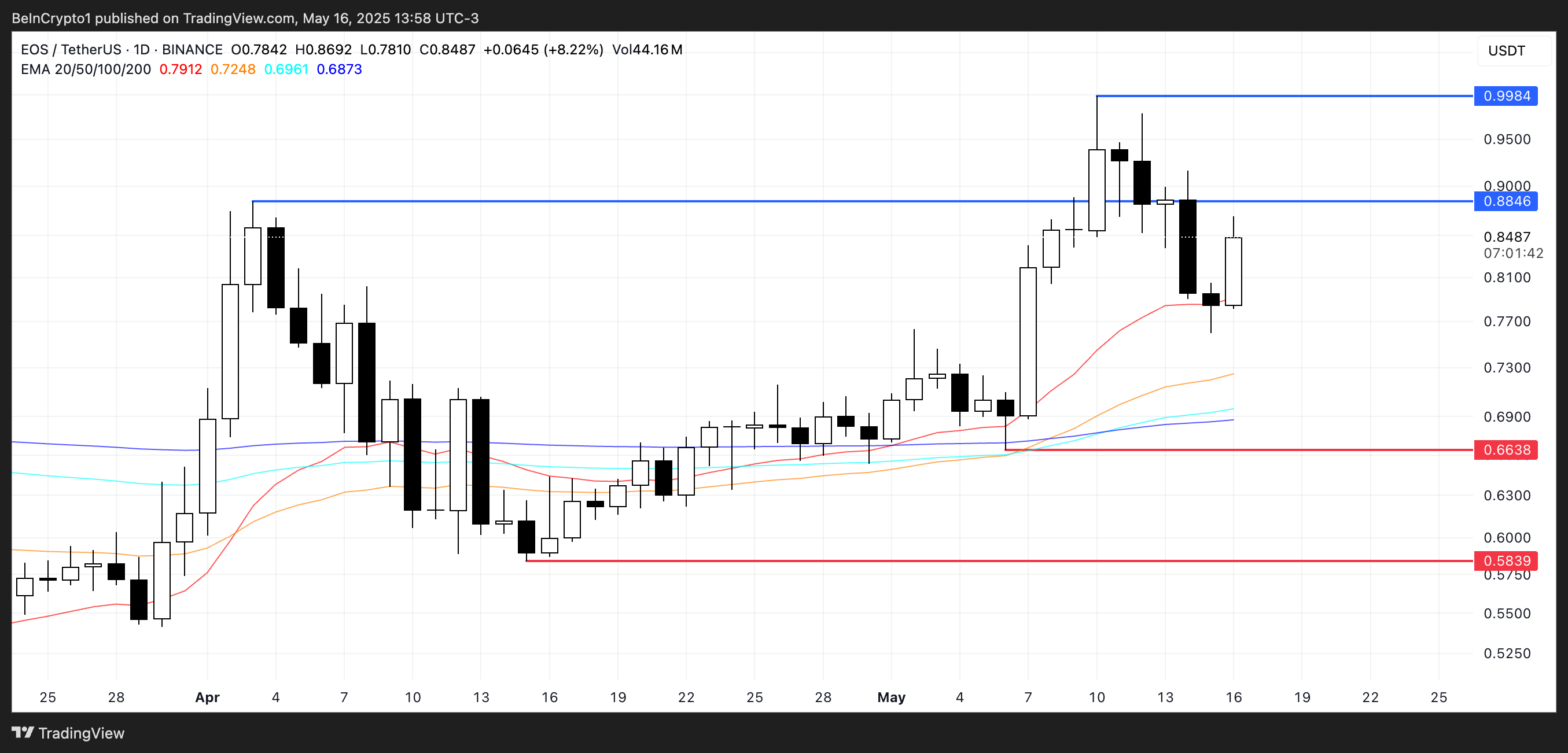Technisch gezien, als het bullish momentum aanhoudt, zou EOS boven het belangrijke weerstandsniveau van $0,88 kunnen breken. Een duidelijke uitbraak daar kan de deur openen voor een stijging richting de psychologische grens van $1.