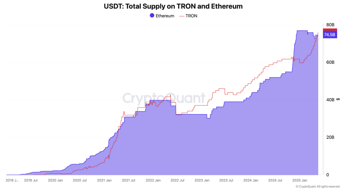 Volgens gegevens van CryptoQuant heeft Tron’s totale circulerende USDT $75,8 miljard bereikt. Het heeft Ethereum ingehaald te midden van de stijgende adoptie van Tron voor betalingen en overmakingen.
