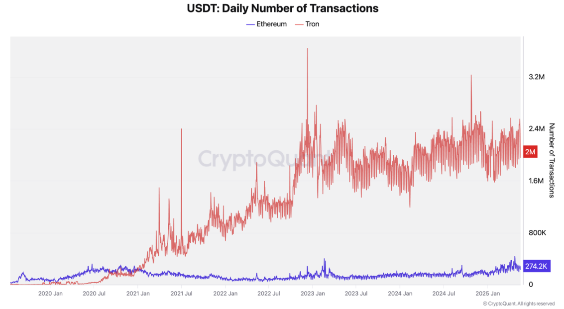 Het aantal dagelijkse USDT-transacties op Tron overtreft ook Ethereum. Terwijl Tron 2,4 miljoen dagelijkse transacties heeft verwerkt, heeft Ethereum er slechts 284.000 verwerkt.