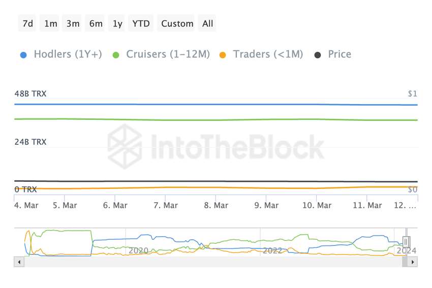 In de afgelopen week is er een opmerkelijke toename geweest in het aanbod van TRX in handen van Traders. Hun hoeveelheid TRX groeide van 2,95 miljard naar 3,73 miljard. Deze verandering vertegenwoordigt een stijging van ongeveer 26,44%, wat suggereert dat kortetermijn holders een groter aandeel krijgen in de circulerende voorraad.