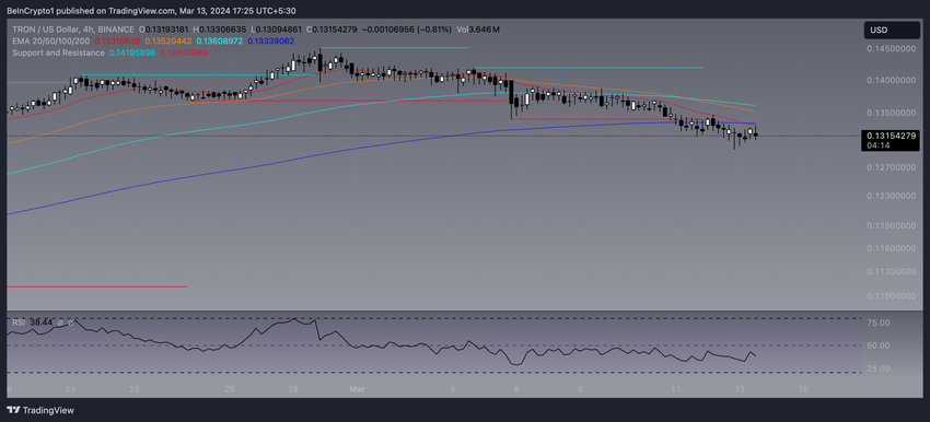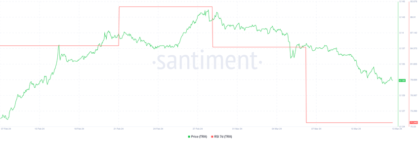 In de laatste dagen van februari piekte de 7-daagse Relatieve Sterkte Index (RSI) voor TRX op 91. Dit duidde op een zeer overgekochte conditie. Dit gaf een zeer overbought conditie aan. Sinds die piek heeft de RSI een aanzienlijke daling laten zien tot 71. Hoewel dit een sterke daling van ongeveer 22% is, wordt een RSI-waarde boven 70 nog steeds als overbought beschouwd.