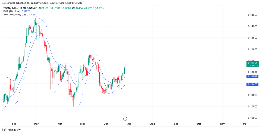 Met aanhoudende koopdruk op de markt, wordt TRX momenteel gevolgd door aanzienlijke bullish sentimenten. Dit wordt bevestigd door de positie van de stippen die de Parabolic Stop and Reverse (SAR) indicator van de coin vormen. Op dit moment liggen deze stippen onder de koers van TRX.