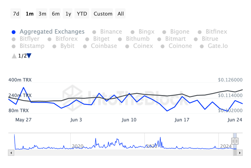 Desondanks hebben sommige handelaren gebruik gemaakt van de recente koersstijging om winst te maken door een deel van hun TRX-bezittingen te verkopen. Het volume van de instroom naar exchanges van de altcoin is in de afgelopen 30 dagen met 4% gestegen.