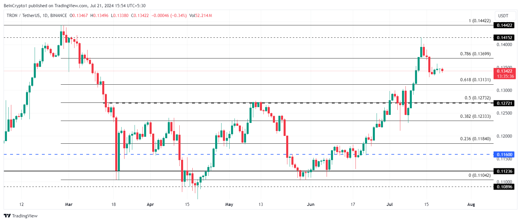 De Tron koers is er niet in geslaagd om een nieuwe year-to-date high neer te zetten. De altcoin handelt op $0,134, wat boven de steun van $0,131 ligt. Dit niveau valt samen met de 61,8% Fibonacci Retracement-lijn.
