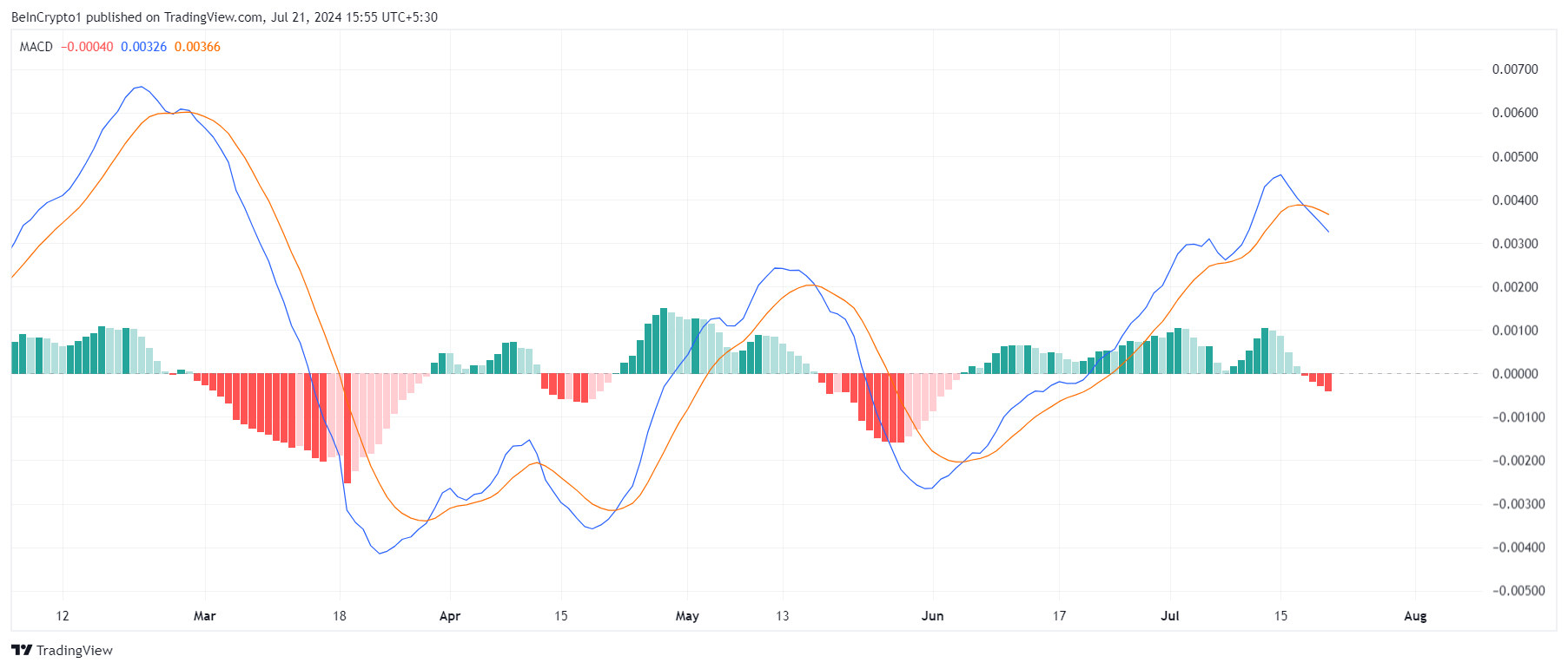 De Tron koers noteerde een paar dagen geleden een daling, maar heeft zich sindsdien gestabiliseerd. Het is echter mogelijk dat dit niet zo blijft. Dit komt doordat de Moving Average Convergence Divergence (MACD) van TRX een potentiële daling laat zien. De indicator registreerde zijn eerste bearish crossover in meer dan anderhalve maand.