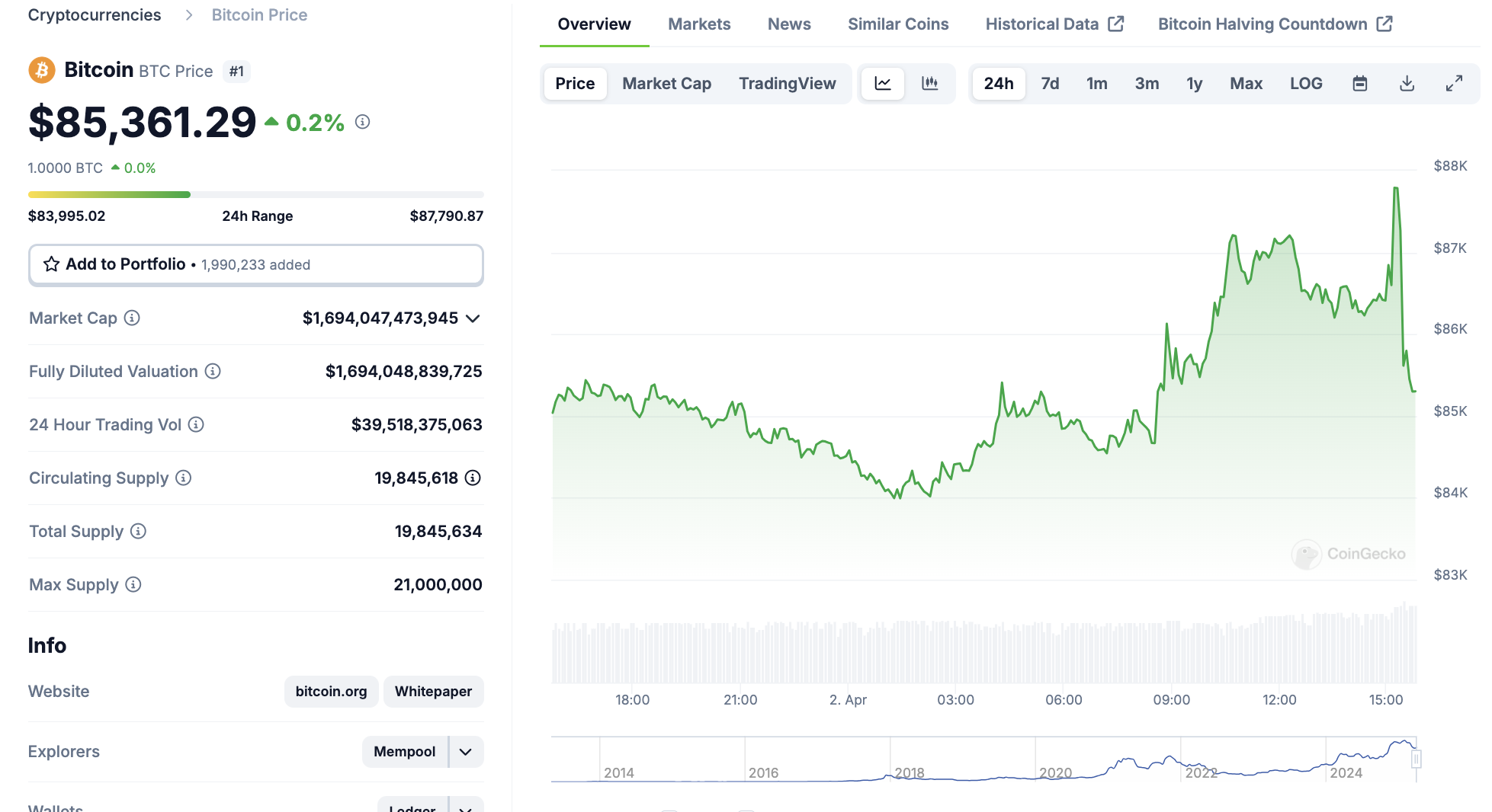 De onzekerheid rond Liberation Day heeft sterk de angst voor een Amerikaanse recessie aangewakkerd. Terwijl Trump’s toespraak voortduurde, dook de aandelenmarkt, met Nasdaq-100 futures die met 2,6% daalden en S&P futures die met 1,67% daalden en nog steeds dalen. De Bitcoin koers gedroeg zich vergelijkbaar en daalde met ongeveer 1,4%.