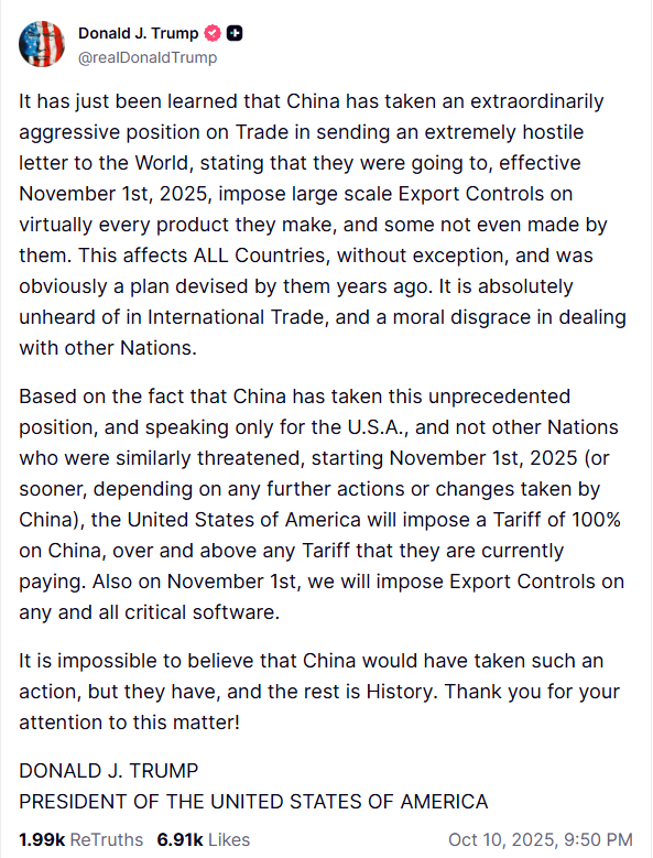 In een online gepubliceerde verklaring zei Trump dat de VS een tarief van 100% zou opleggen op alle Chinese importen vanaf 1 november, verwijzend naar wat hij noemde Beijing’s “buitengewoon agressieve” stap om brede exportcontroles op te leggen op “praktisch elk product dat ze maken”.