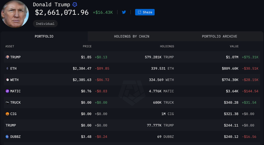 De Wallet met TRUMP bevat nu ongeveer $ 2 miljoen in crypto. De koers van TRUMP lag in november rond de $0,19. Het wordt verhandeld voor $ 2,05 en heeft een marktkapitalisatie van meer dan $ 85 miljoen.