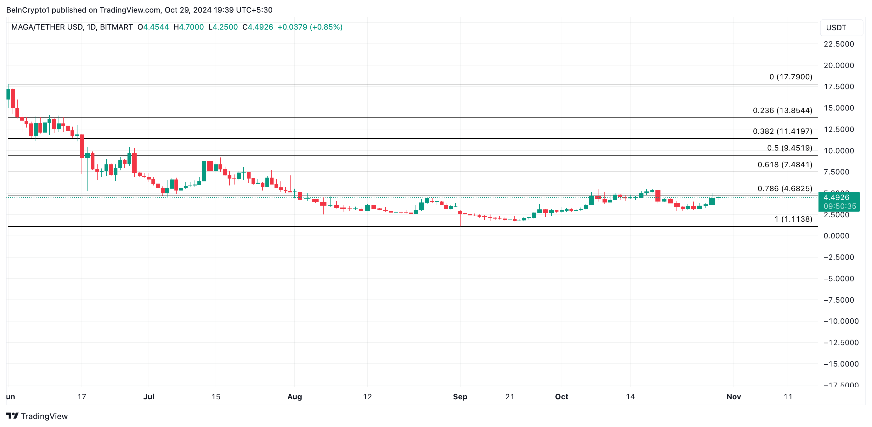 TRUMP handelt op $4,49, net onder het weerstandsniveau van $4,68. Als de bullish momentum van de bredere markt aanhoudt, zou TRUMP kunnen rallyen en deze weerstand doorbreken. Naarmate de algemene verkiezingen van 4 november naderen, zou een succesvolle doorbraak boven $4,68 de weg vrijmaken voor TRUMP om $7,48 te bereiken—een niveau dat het voor het laatst bereikte in juli.