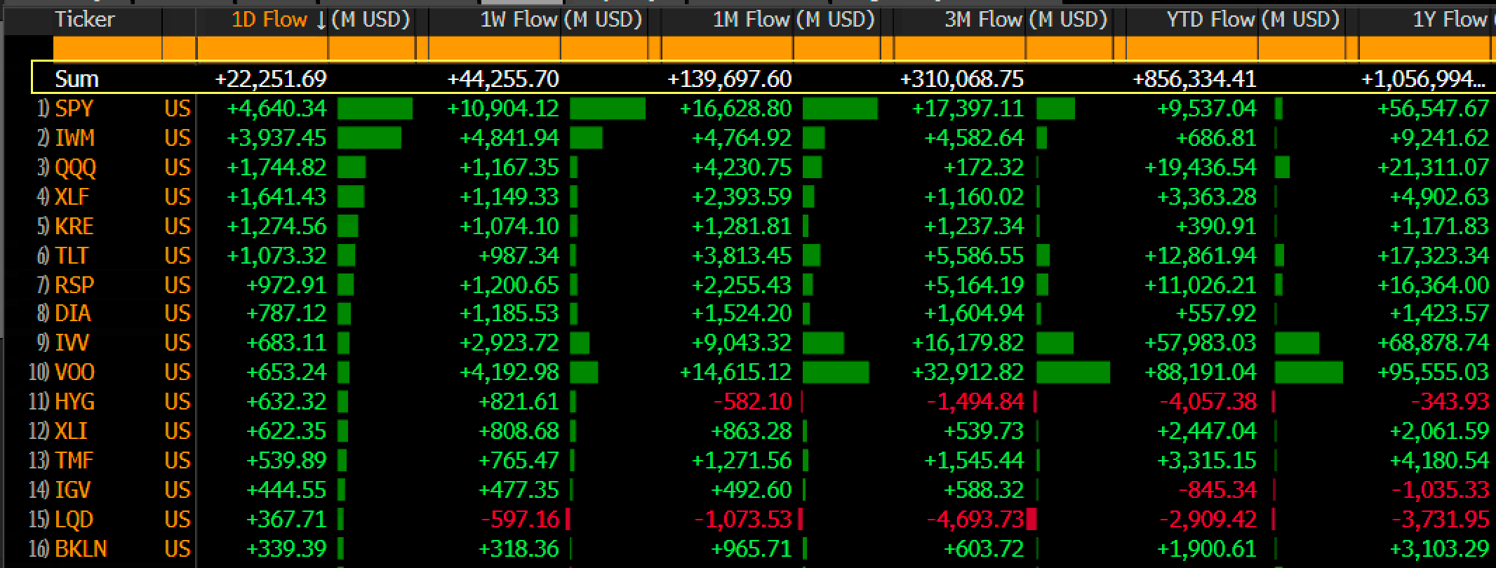 Sponsored“FLOWMAGEDDON: Een door Trump geïnspireerde geldstroom stroomt naar risicovolle ETF’s. +$22 miljard op één dag is absurd, dat is normaal gesproken een goede WEEK. YTD netto instroom nu +$856 miljard, ($55 miljard verwijderd van het jaarrecord) en de rollende 1 jaar heeft $1 biljoen gepasseerd,” verklaarde Balchunas via een sociale media-post.