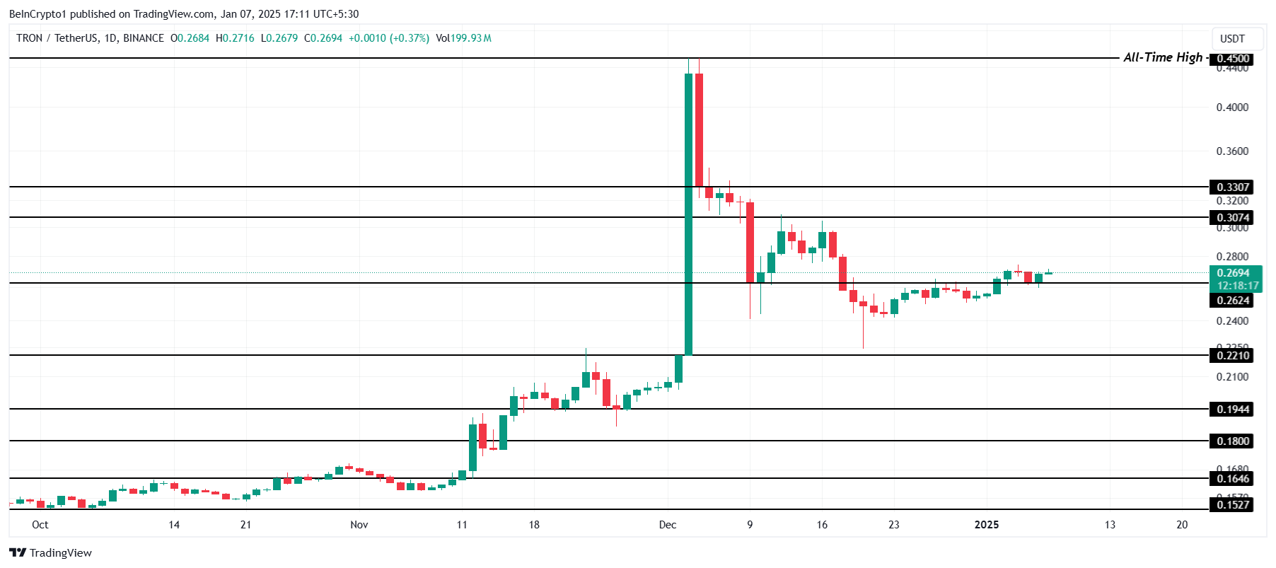 Tron’s koers heeft onlangs een daling meegemaakt en worstelt om het kritieke steunniveau van $0,26 terug te winnen. Dit niveau is cruciaal voor het herstellen van de verliezen die zijn opgelopen tijdens de recente marktvolatiliteit.