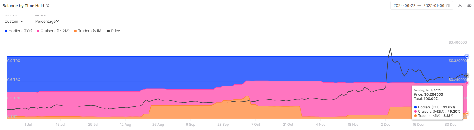 Korte-termijn houders (STH’s) vormen vaak uitdagingen voor cryptocurrencies vanwege hun neiging om te verkopen tijdens dalingen. Echter, in Tron’s geval, veranderen STH’s in midden-termijn houders (MTH’s), die hun activa langer dan een maand vasthouden. Deze verschuiving, met een daling van 11% in STH-dominantie over twee weken, duidt op groeiend vertrouwen van investeerders.