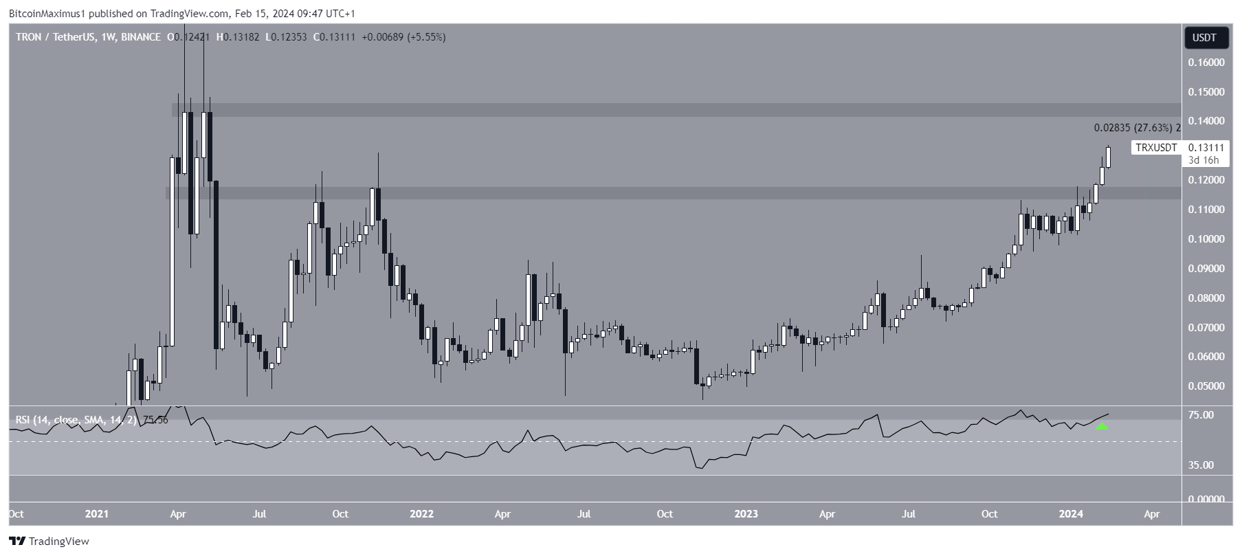 Het wekelijkse tijdframe laat zien dat de TRX koers in 2024 met bijna 30% is gestegen. Meer recent creëerde het vier opeenvolgende bullish wekelijkse candlesticks.
