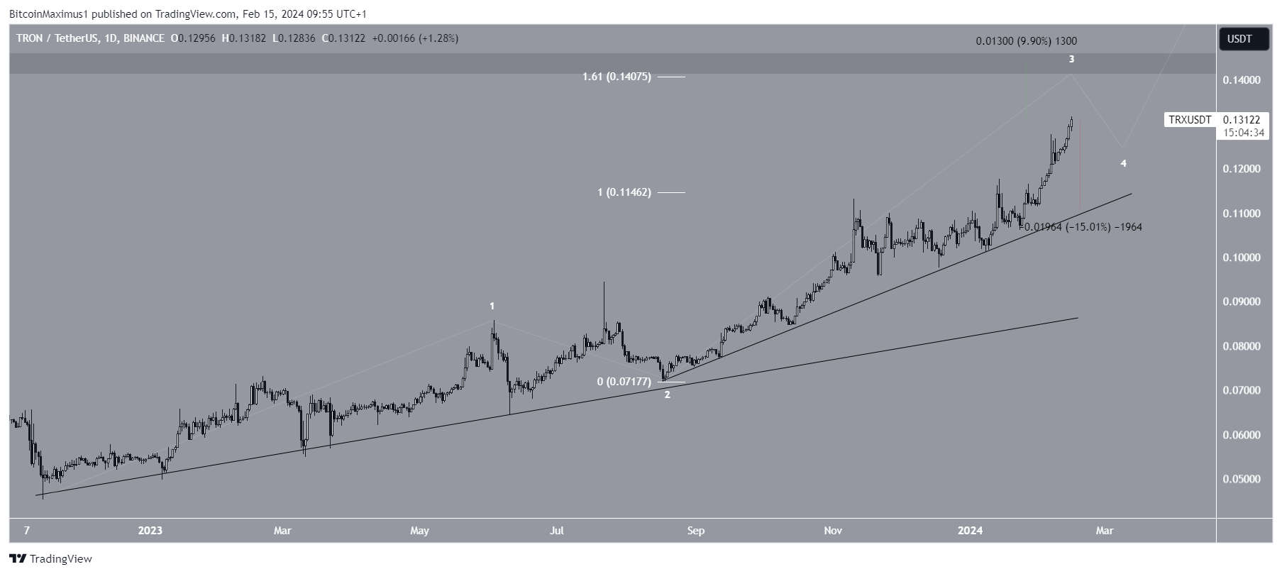 Als golf één en drie een 1:1.61 ratio krijgen, kan dit leiden tot een high van $0.140, 10% boven de huidige koers. Dit zou TRX dicht bij zijn top van $0.181 in 2021 brengen.