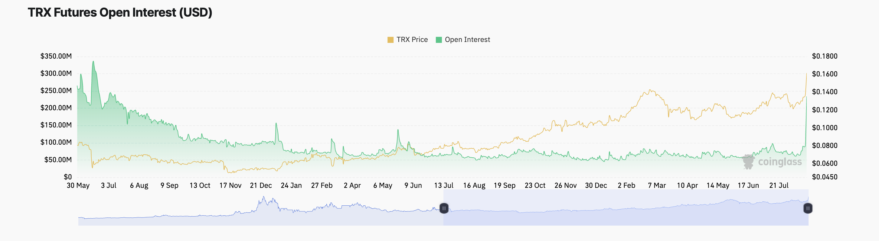 Daarnaast is de recente koersstijging van TRX vergezeld gegaan van een opmerkelijke toename in futures open interest. Gegevens van Coinglass onthullen dat de open interest met 77% is gestegen in de afgelopen 24 uur, en een tweemaandelijkse high heeft bereikt.