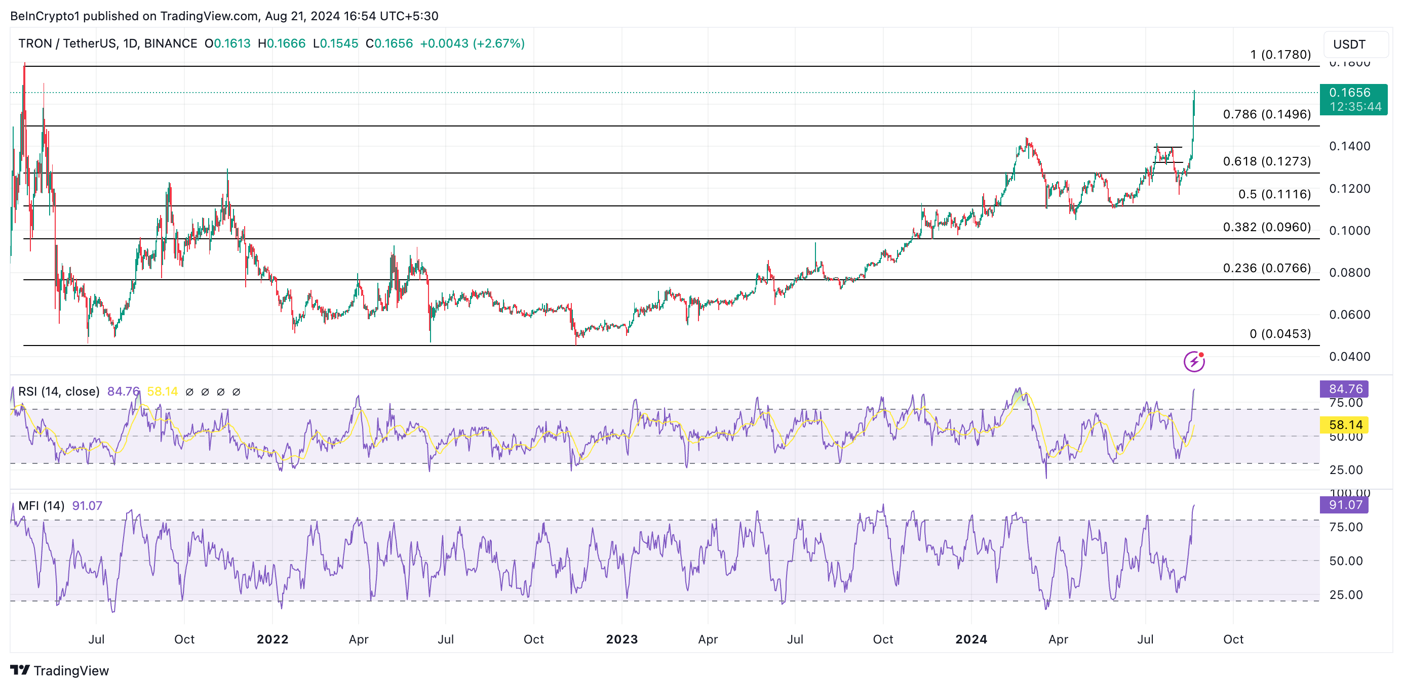 Een analyse van de belangrijkste momentumindicatoren van TRX suggereert dat een mogelijke correctie op komst is. Momenteel is de Relative Strength Index (RSI) 84,76, terwijl de Money Flow Index (MFI) 91,07 is.
