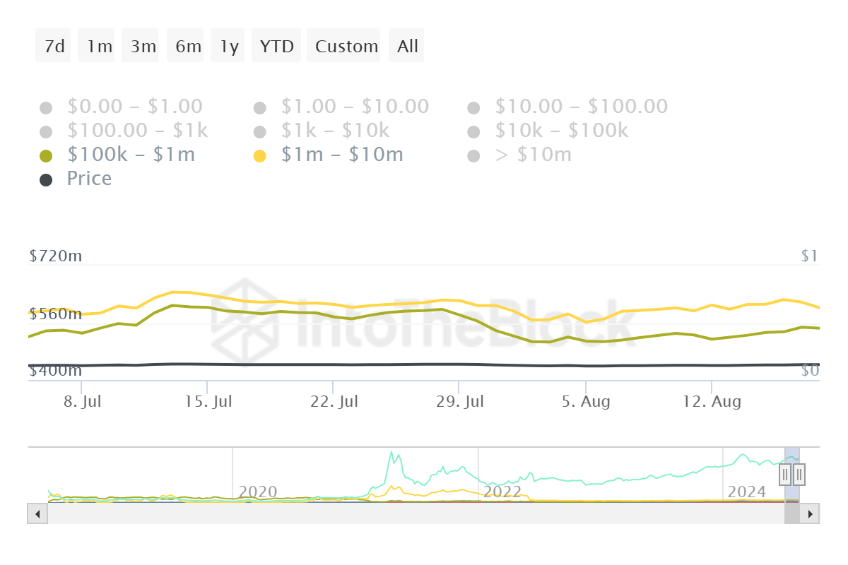 In de laatste 72 uur alleen al hebben adressen die tussen $1 miljoen en $10 miljoen aan TRX bezitten, meer dan $23 miljoen van hun bezit verkocht. Hun totale voorraad staat nu op $601 miljoen, gedaald van $624 miljoen.