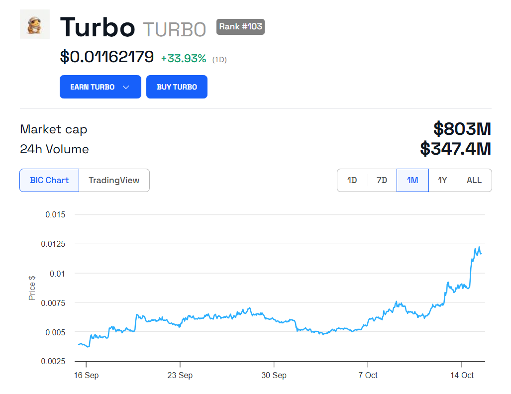 TURBO meme coin stijgt 116% in oktober: bereikt nieuwe all-time high