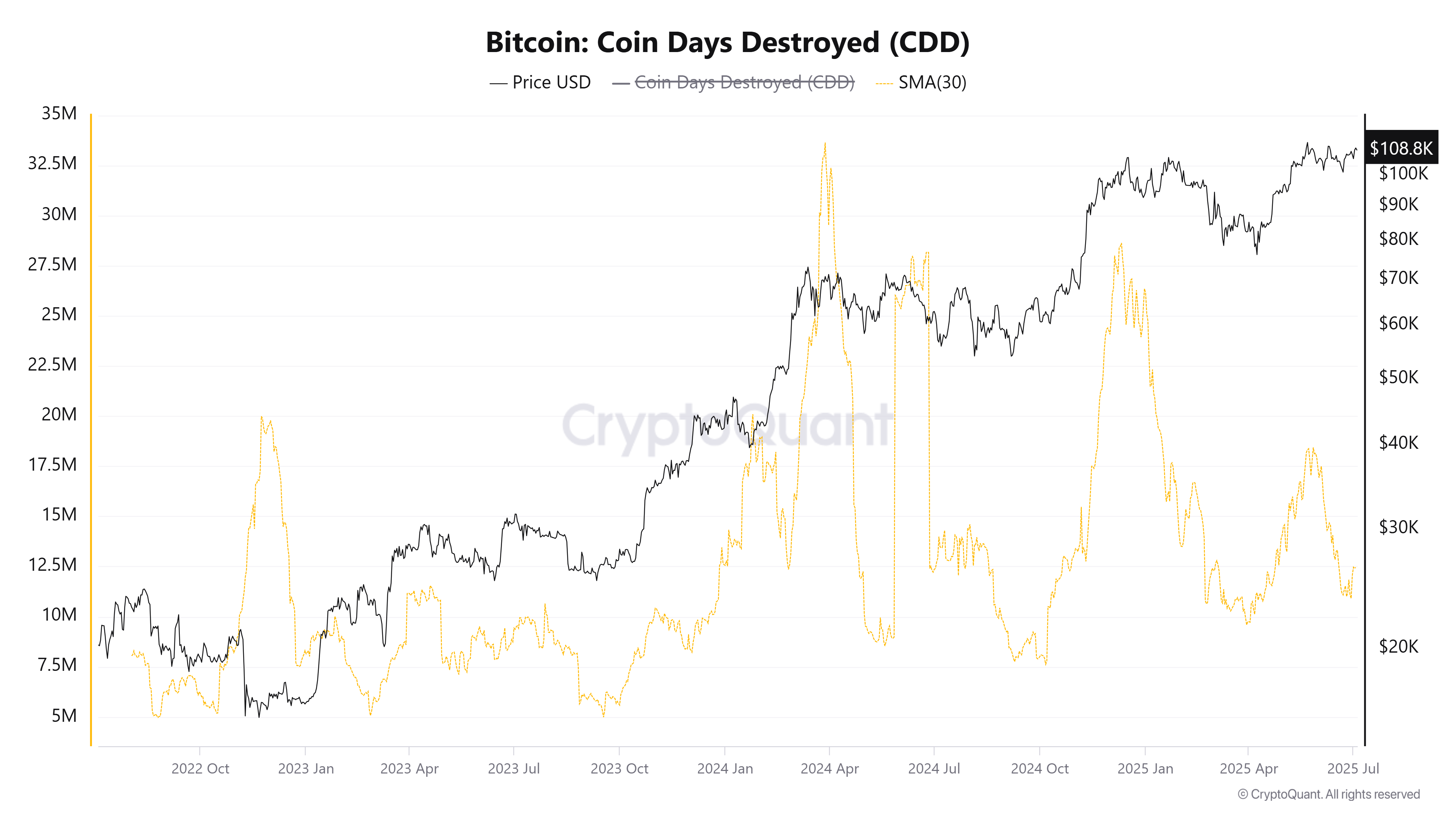 Gegevens van CryptoQuant tonen aan dat de CDD steeg van 10 miljoen naar 17,5 miljoen in Q2, voordat het begin juli weer daalde naar 11 miljoen.