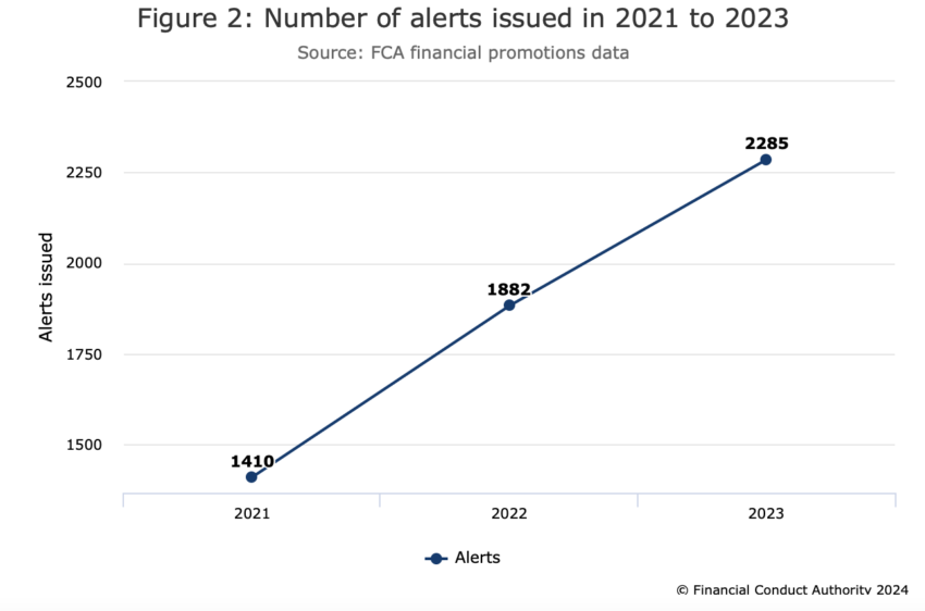 De FCA heeft haar waarschuwingen over het promoten van financiële producten de afgelopen twee jaar opgevoerd. Alleen al in 2023 hebben ze 2.285 waarschuwingen uitgegeven. Dit geeft aan dat cryptowaarschuwingen ongeveer 20% van alle waarschuwingen uitmaken.