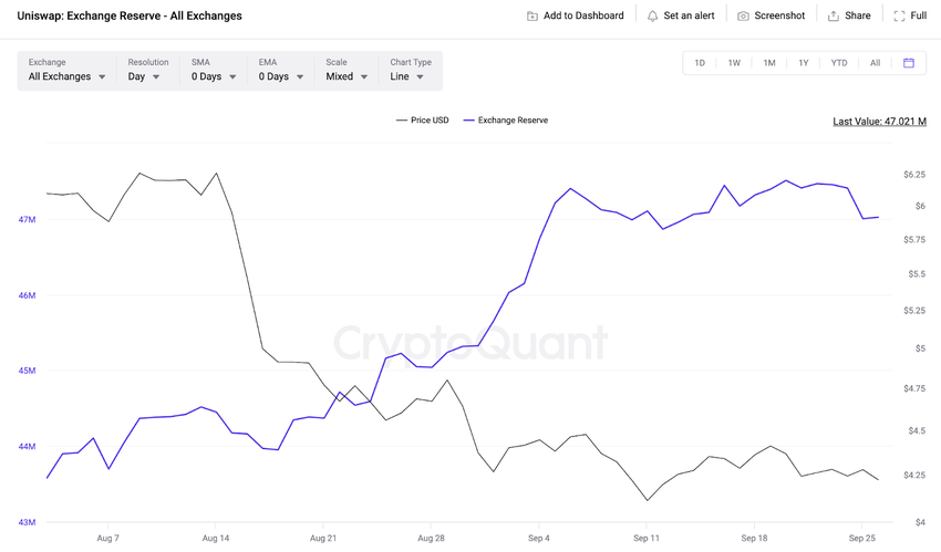 Aan het einde van augustus stond het totale aantal Uniswap tokens in wallets op de beurs op 45,3 miljoen. Maar vanaf 26 september is dat aantal gestegen tot 47,02 miljoen. Dit vertegenwoordigt een netto-instroom van 1,7 miljoen tokens die deze maand zijn gestort op verschillende cryptobeurzen.