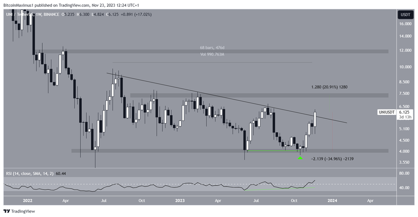 De Uniswap (UNI) koers is sinds oktober sterk gestegen. Het breekt uit de dalende weerstandtrendlijn op lange termijn.