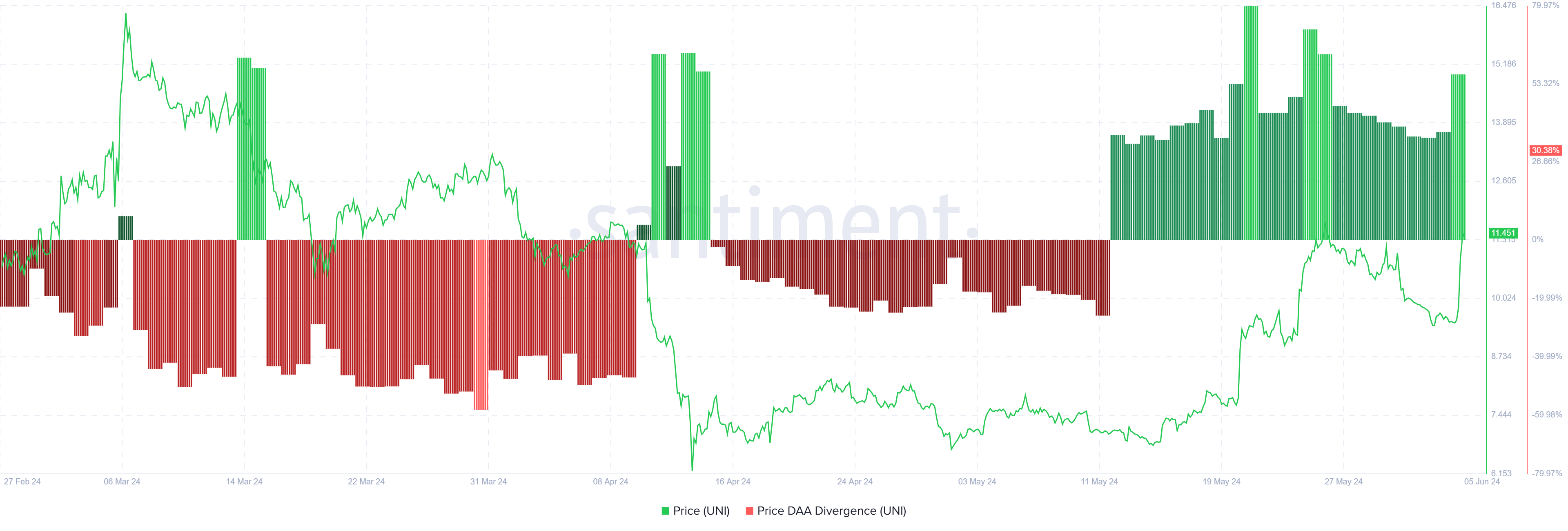 Uniswap koers DAA divergentie. Bron: Santiment