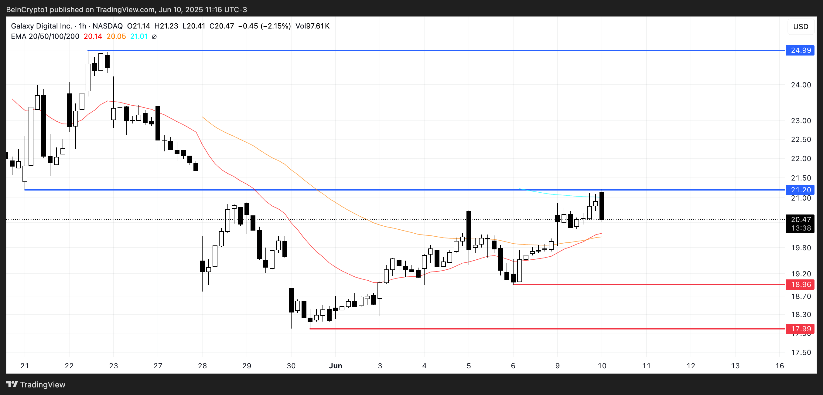 Omgekeerd, als de huidige neerwaartse correctie aanhoudt, kan GLXY het steunniveau van $18,96 testen.
