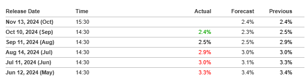 De Amerikaanse CPI voor september was 2,4%, een daling ten opzichte van 2,5% in augustus en 2,9% in juli. Dit suggereert een algemene afname van de inflatie sinds april.