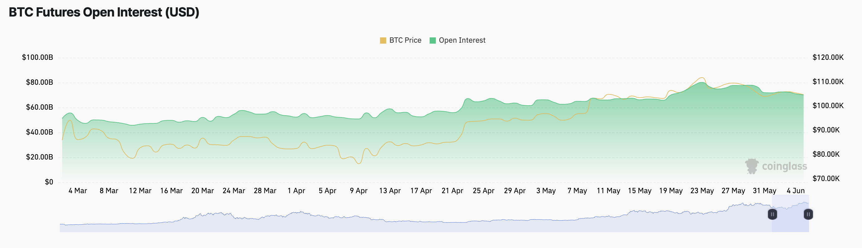 Momenteel verhandeld op $104.913, is BTC met 1% gedaald in de afgelopen dag, wat de heersende zijwaartse trend weerspiegelt. Tegelijkertijd is de futures open interest licht gedaald, wat wijst op verminderde activiteit en een algemene pauze in marktdeelname.