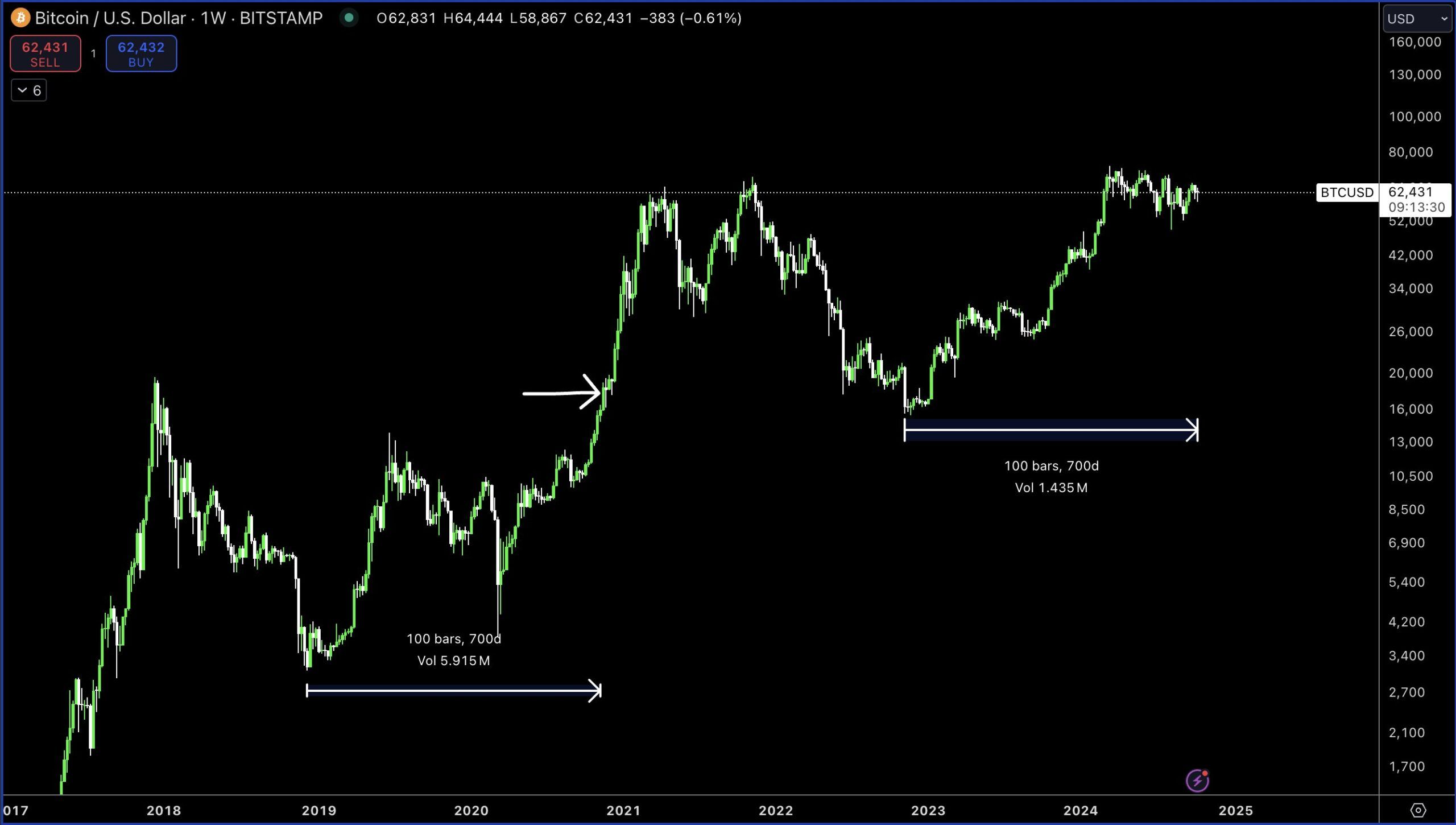 De analyse van CRG suggereert dat de huidige fase van Bitcoin lijkt op de cyclus van eind 2020. Hij merkte op dat meer dan 100 weken na Bitcoin’s low de koers doorgaans stijgt naar een nieuwe piek, gevolgd door een altcoin-rally een week later.