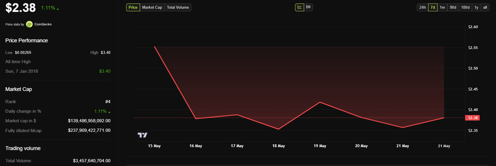 Ondertussen blijft XRP onder $2,50 handelen, met een daling van 7% in de afgelopen week.