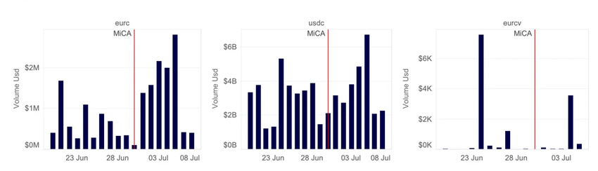 Volgens het rapport hebben USDC en zijn zusje, de in euro luidende EURC stablecoin, het sterkste dagelijkse trading volume sinds 30 juni, toen het eerste deel van het MiCA-kader in de Europese Unie van kracht werd.