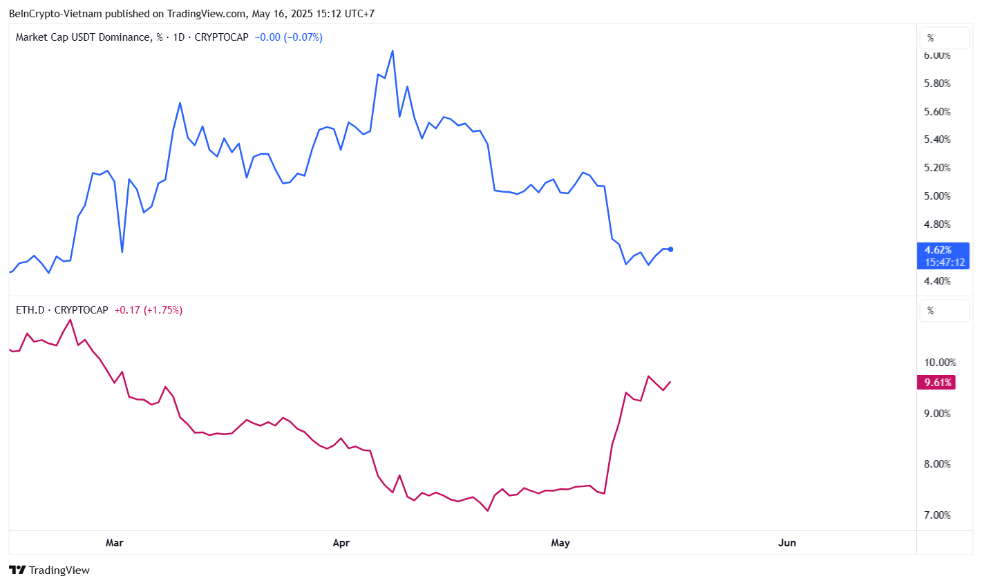 Deze tekenen omvatten Tether’s voortdurende uitgifte van nieuwe USDT en een significante daling in de USDT-dominantie (USDT.D) ratio gedurende mei.
