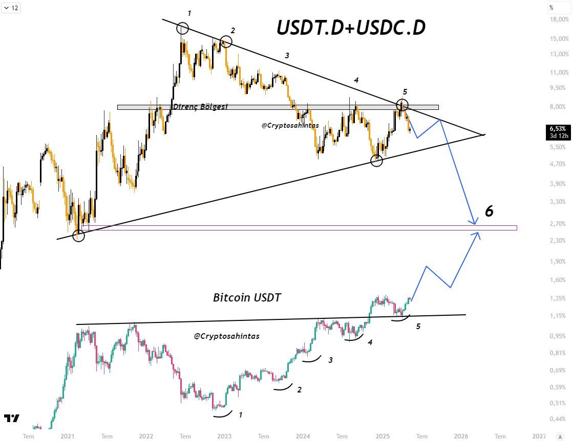 Bovendien bood analist Cryptosahintas diepere inzichten door zowel de USDC.D als USDT.D indices te analyseren. Hij gelooft dat de gecombineerde ratio zal blijven dalen, wat de bullish momentum van Bitcoin in de toekomst verder zou ondersteunen.