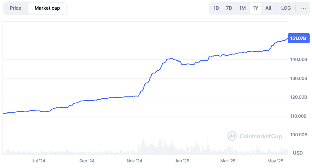 Volgens gegevens van CoinMarketCap heeft Tether’s marktkapitalisatie een nieuwe all-time high bereikt, met meer dan $151 miljard.