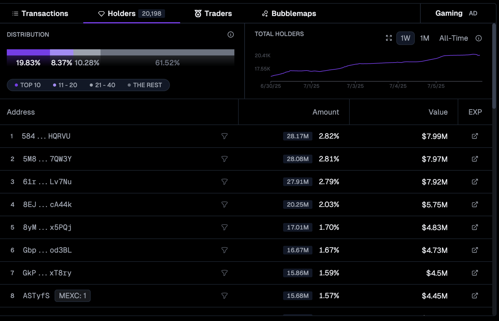 Kijkend naar de houders-grafiek, houdt de top 10 wallets bijna 20% van de totale tokenvoorraad. Het topadres beheert alleen al 2,82% ($7,99 miljoen). Deze verdeling maakt de token kwetsbaar voor grote verkopen.