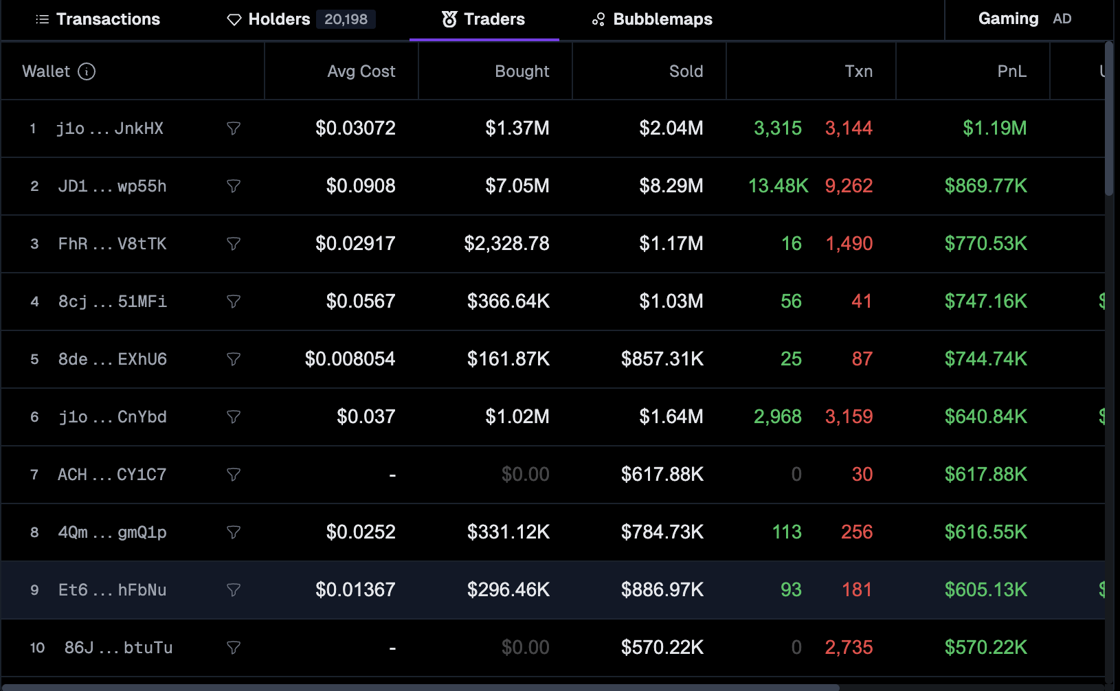 Volgens het GeckoTerminal Traders-tabblad staan 9 van de top 10 wallets diep in het groen. Eén adres heeft meer dan $1,19 miljoen aan winst behaald, terwijl een ander $869.000 heeft bereikt. Zelfs kleinere wallets hebben aankopen van vijf cijfers omgezet in enorme winsten.