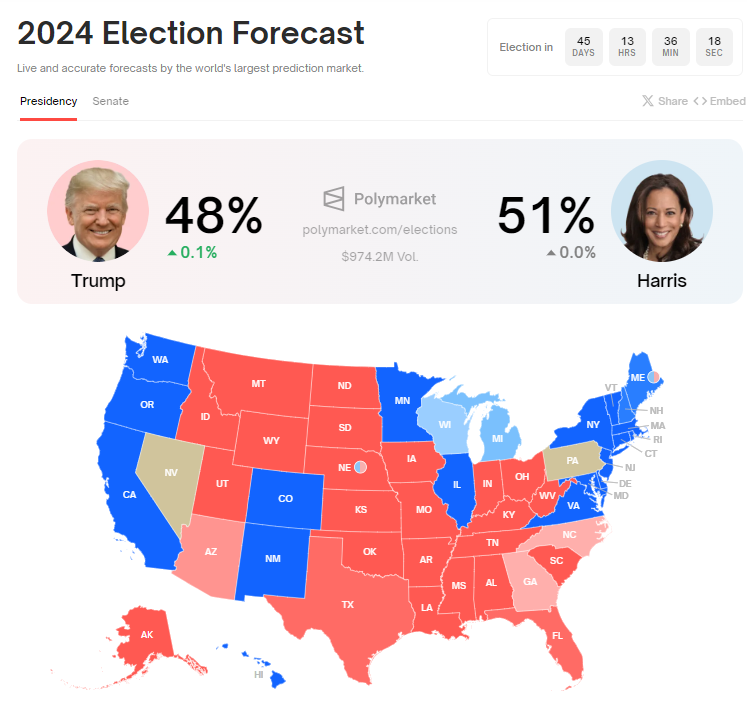 In tegenstelling, suggereerde VanEck dat een presidentschap van Trump de gehele crypto-industrie zou kunnen bevoordelen. De administratie van Trump zou waarschijnlijk deregulering en pro-bedrijfsbeleid bevorderen, waardoor de regeldruk op crypto-ondernemers wordt verlicht. Opvallend is dat belanghebbenden in de crypto over het algemeen een voorkeur hebben voor een presidentschap van Trump, vanwege zijn sterkere pro-crypto houding.