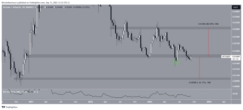 Als de koers onder het gebied sluit, zal dat waarschijnlijk leiden tot een daling van 35% naar de volgende steun op $0,010. Als de VET koers het gebied weet te heroveren, kan het leiden tot een stijging van 80% naar de $0,028-weerstand.