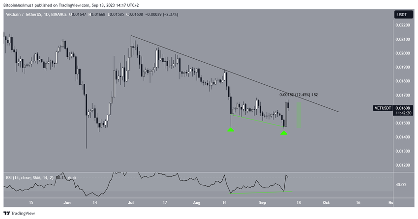 Voor een volledige bevestiging van het patroon moet VET door een dalende weerstandslijn breken die sinds juli actief is. Deze lijn valt samen met de horizontale zone rond $0,016. Een uitbraak boven dit niveau zou een duidelijke bevestiging zijn van een bullish trendomkeer.