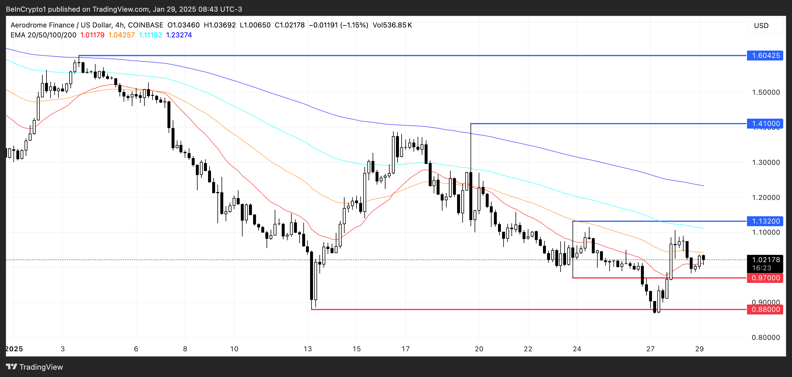 In de afgelopen maand is AERO bijna 31% gedaald en handelt nu rond $1 met een marktkapitalisatie van $765 miljoen. De recente daling heeft het dichter bij belangrijke psychologische niveaus gebracht, waardoor de volgende bewegingen cruciaal zijn.